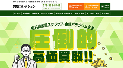 買取コレクションは、金銀パラジウム合金を含む歯科用貴金属の買取を行う業者です。専用工場で分析精錬査定を行い、高額買取につなげています。また金歯・銀歯・研磨粉・撤去冠など幅広い歯科金属に対応し、到着当日の分析・決済にも対応するなど、スピードと価格のバランスに強みがあります。