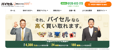 バイセルは各種手数料0円・最短即日査定をしてくれる買取企業です。幅広い買取品目を扱っており、金歯買取も行っています。宅配・店頭買取の他、日本全国出張買取にも対応しています。専門スタッフが最後まで徹底サポートしてくれる点も特徴です。